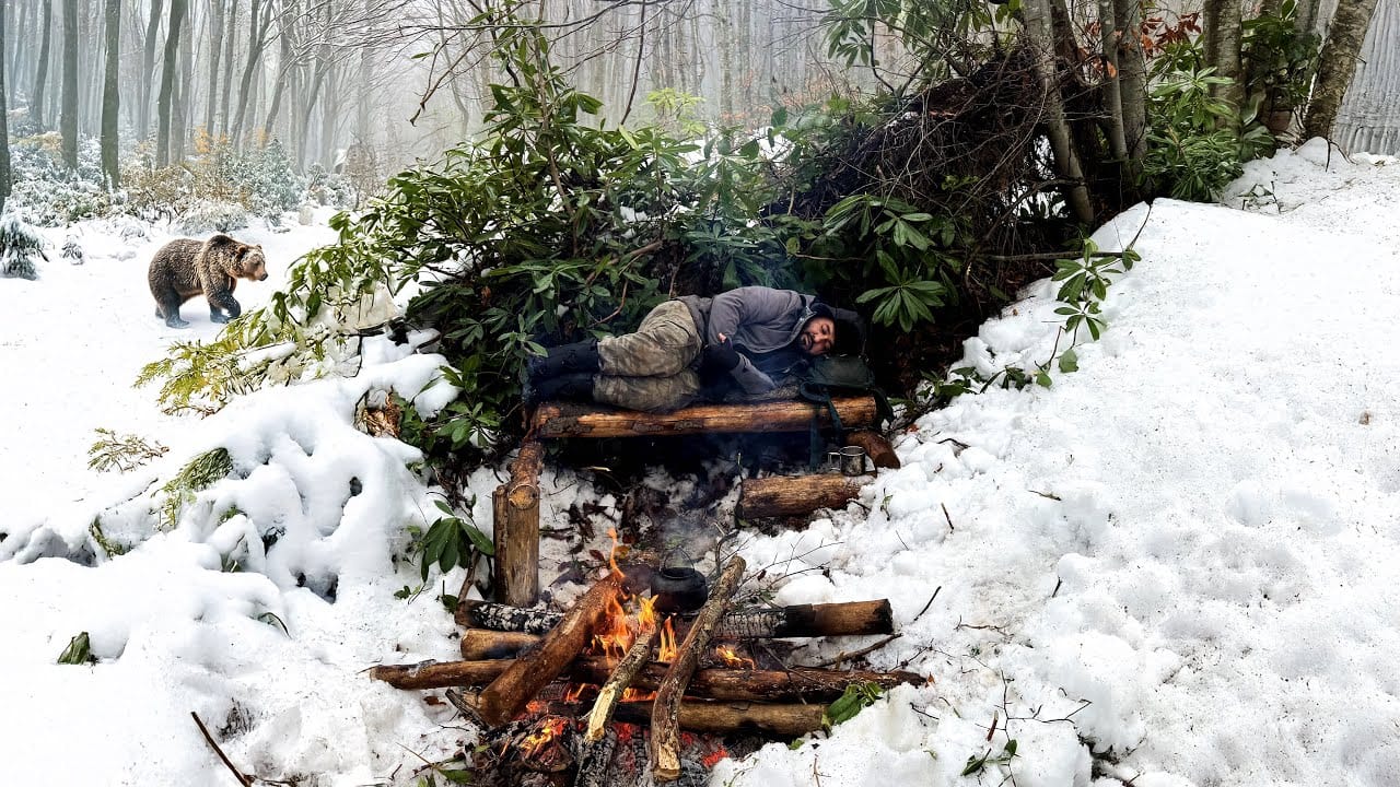 Bushcraft Winter Survival Camping; Alaska winter camp. life in snow. big BEAR. Off grid cooking. What is wrong with me? I spend … source